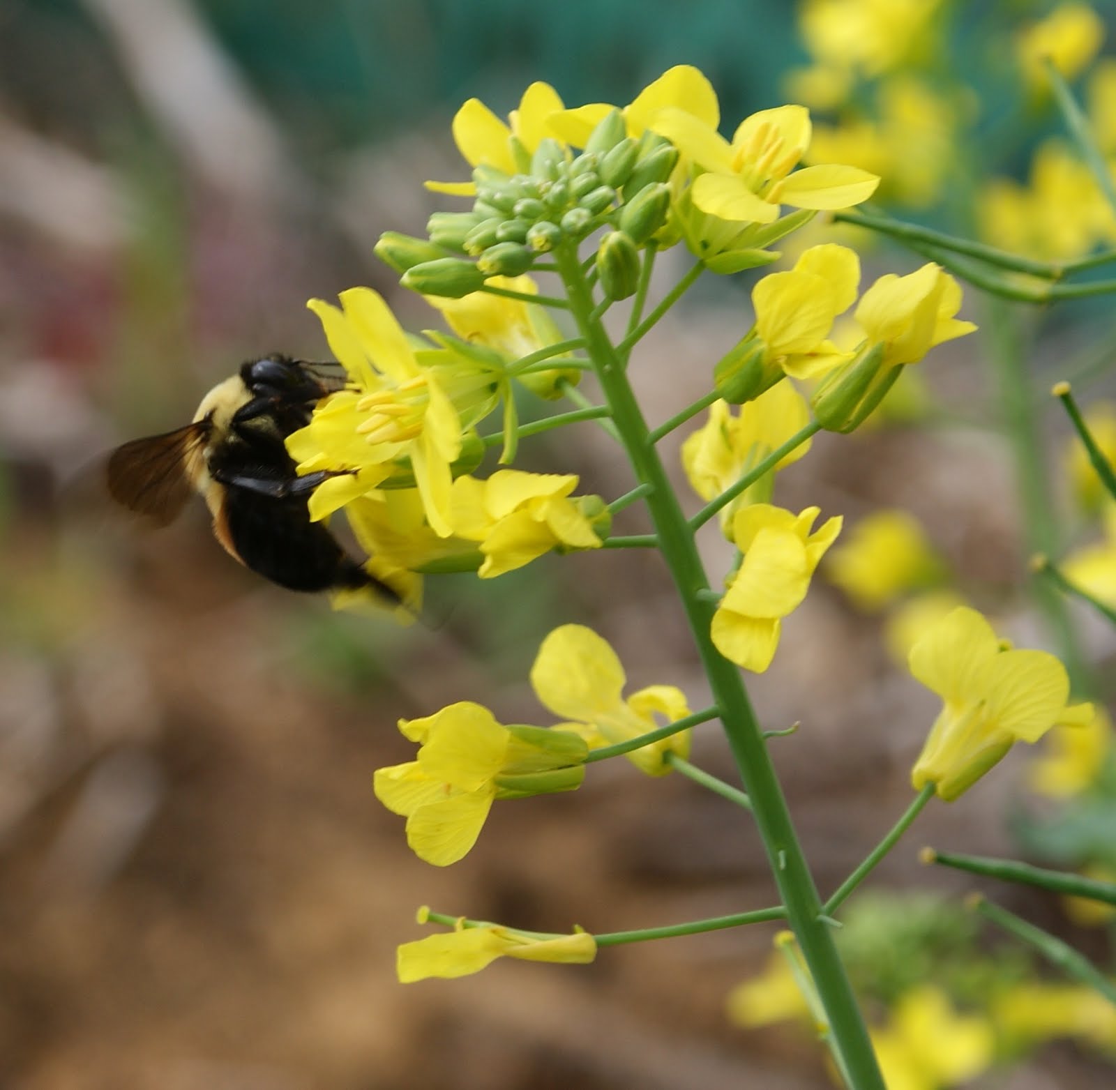 | A bumblee dining from the cross-shaped flowers of collards. |